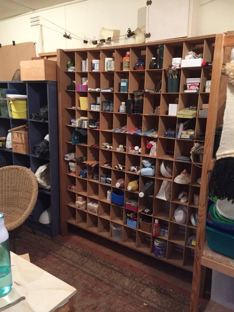 The disused CD rack that my brother made back in the 1990s, little did he know it was perfectly crafted for a different destiny… to become the mask-makers apothecary.